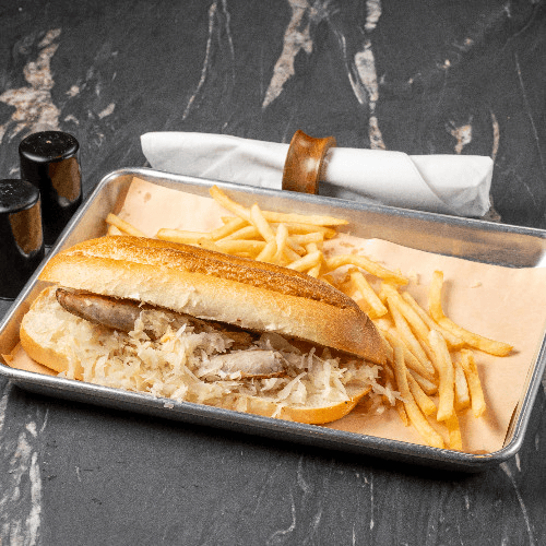 Alpine house bratwurst, sauerkraut, house-made beer mustard, and a sub roll