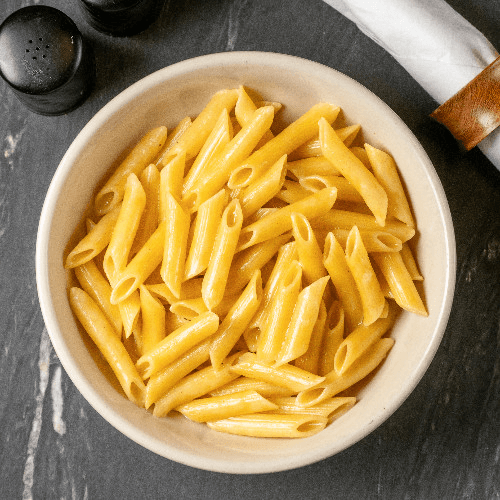 Penne pasta tossed in butter and a kid's drink